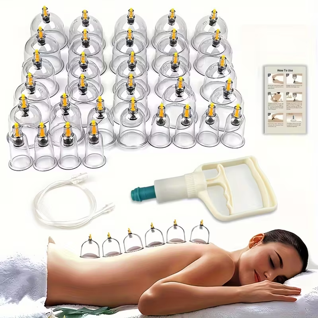 32-piece home cupping set, includes a suction pump, self-cupping tubes, resin gua sha board, acupoint chart, and cupping therapy guide