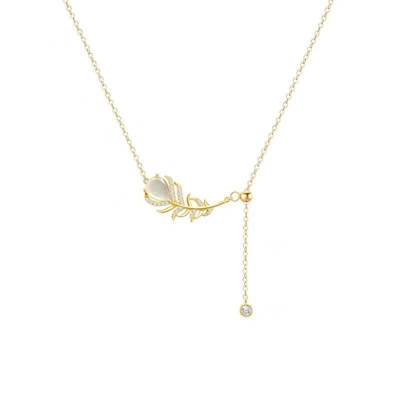 Cat's Eye Feather Diamond Titanium Steel Necklace for Women's Summer New Ins Style Quality Clavicle Chain