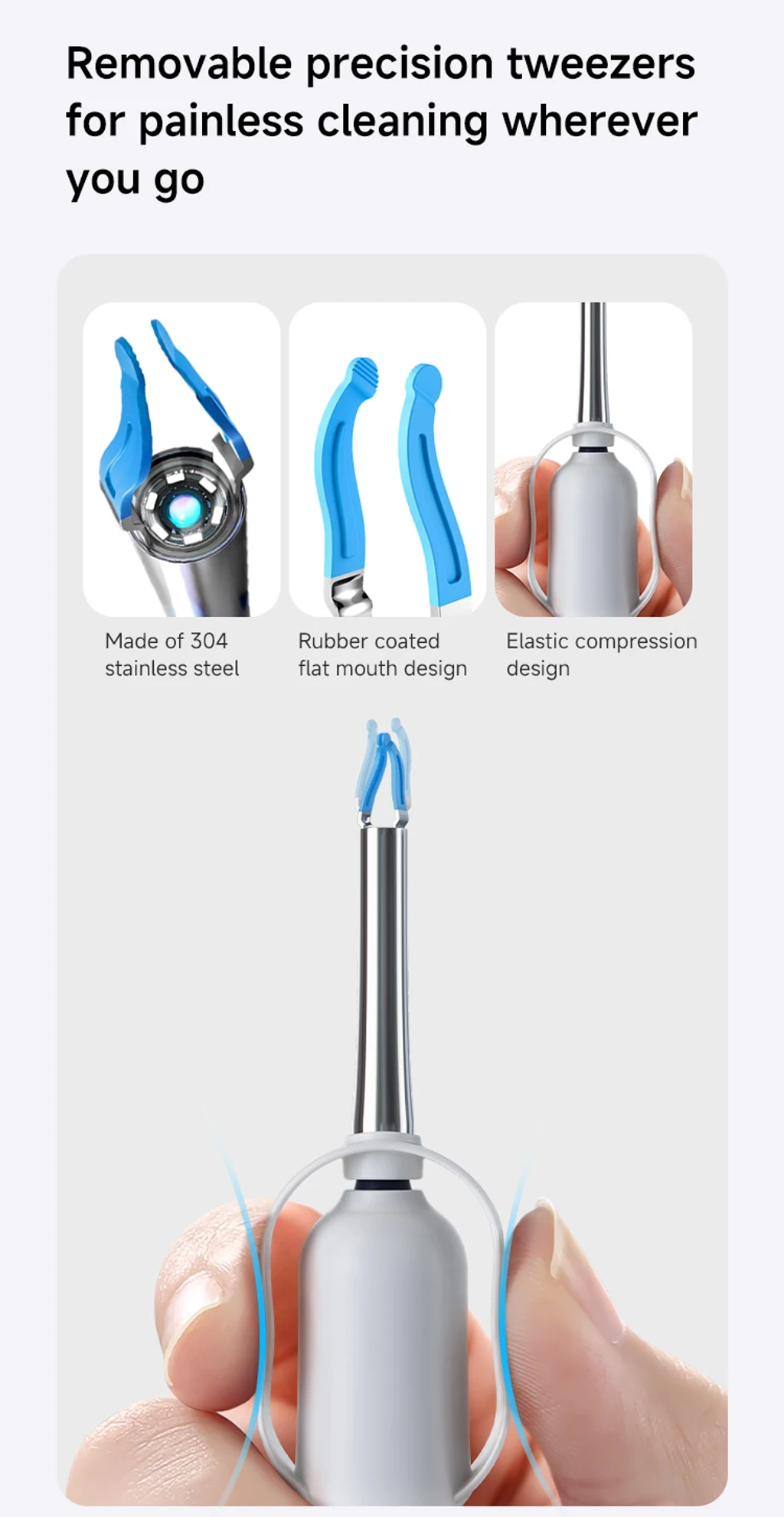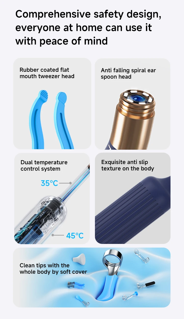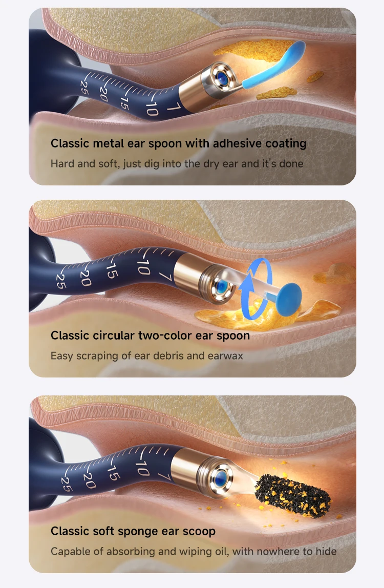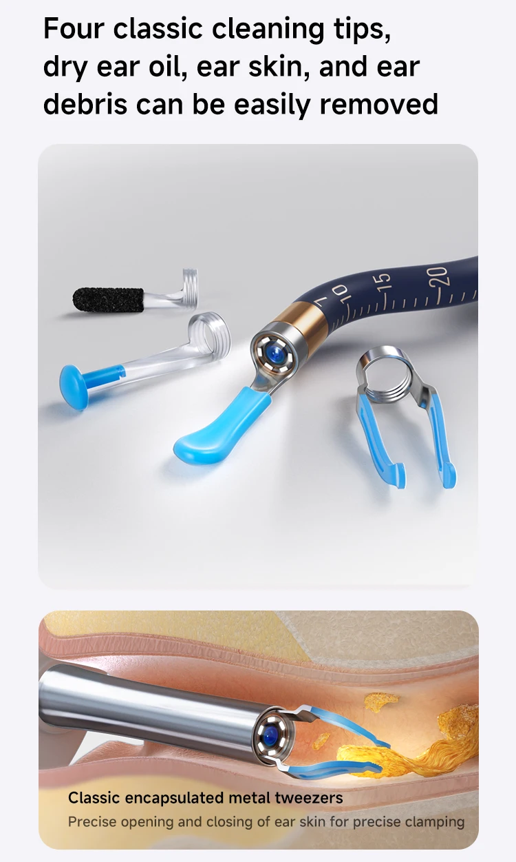 Function 功能 | 12pcs earwax removal tips, 1 set of tweezers, 1 set of Ear,Nasal, Throat Check Tool, Patented Designs and Snaked bendable 镊子,防水相机镜头,续航时间1小时。专为中端市场设计,配备优质一体式收纳盒。 | |||