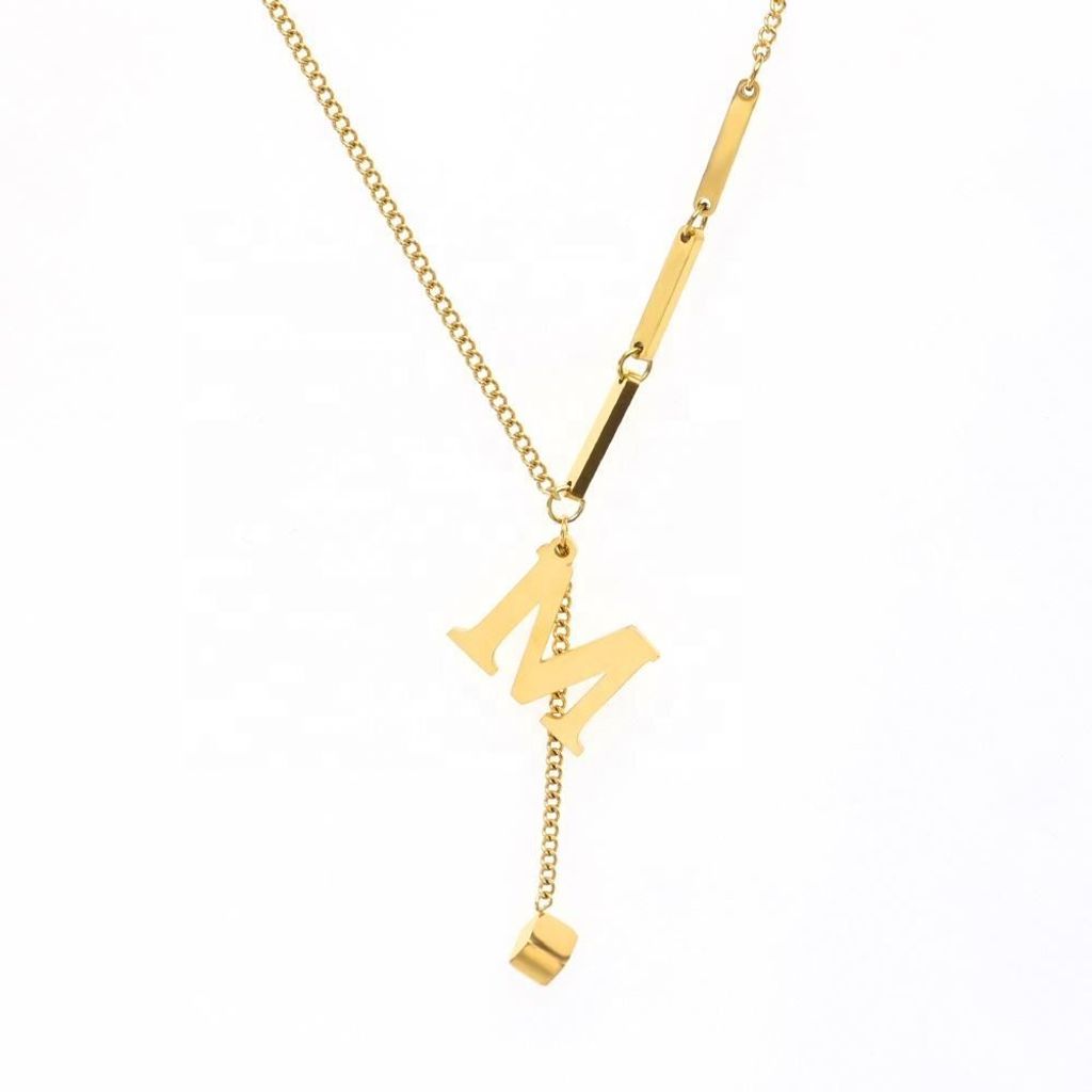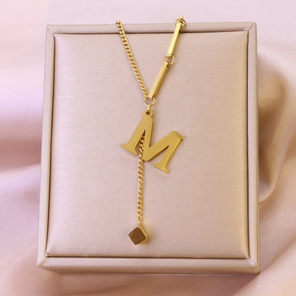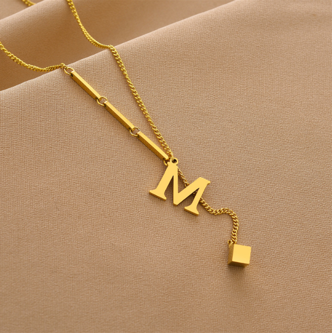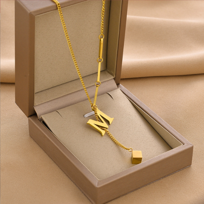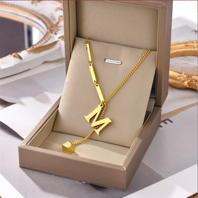 Simplified small square tassel pendant with gold collarbone chain in English letters